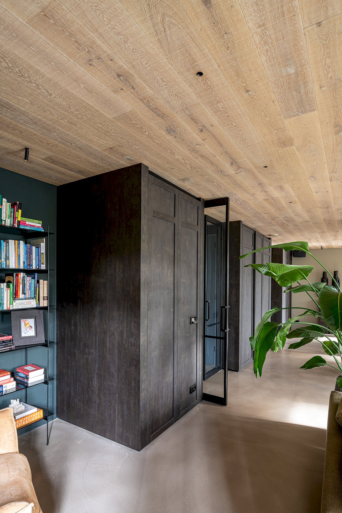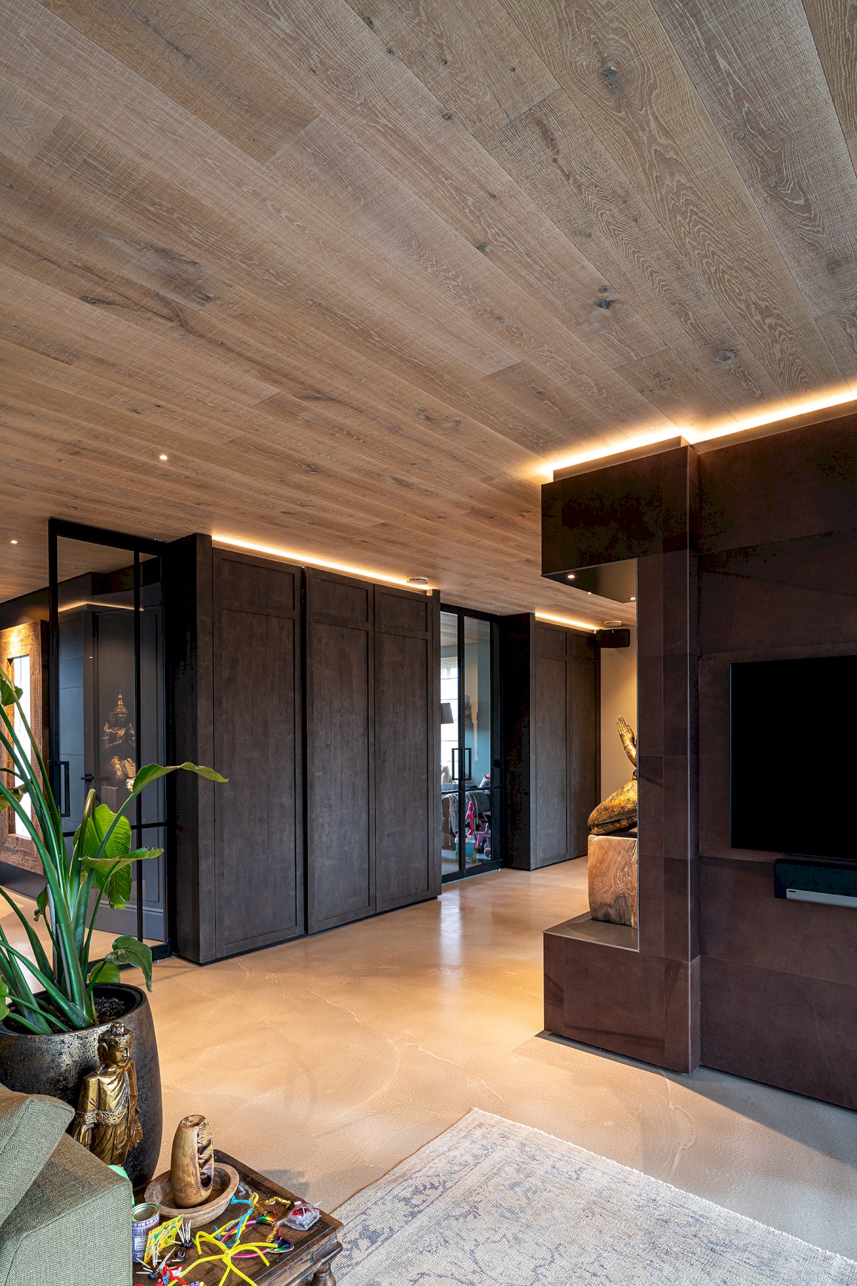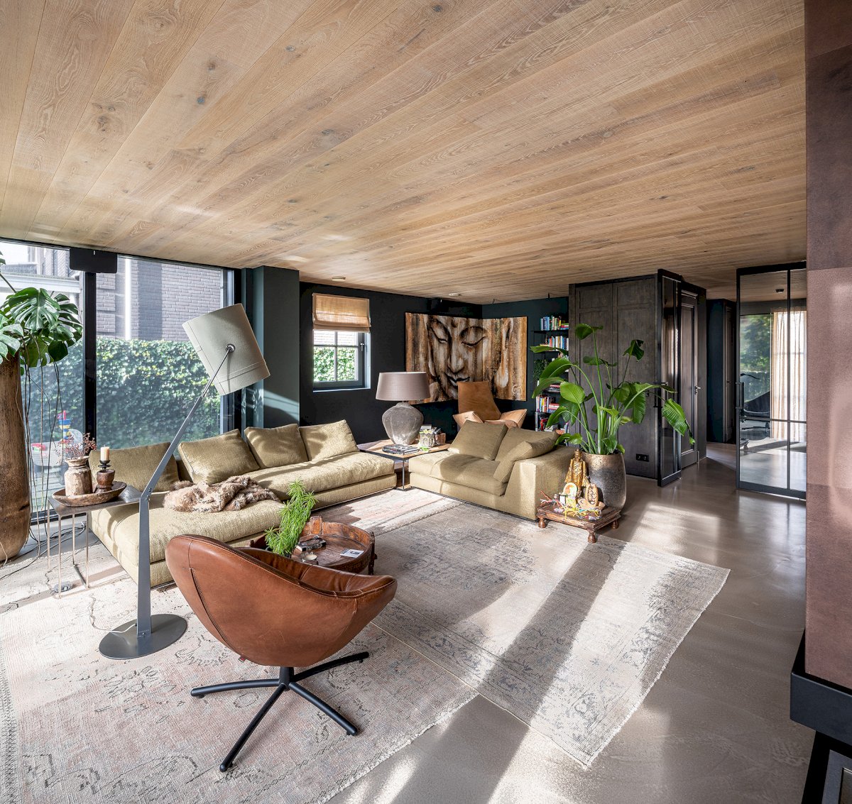 Een vloer die gedeeltelijk doorloopt op de muur van een woonkamer had ik wel eerder gezien, maar het hele plafond van de benedenverdieping van een woning was echt nieuw voor mij.
