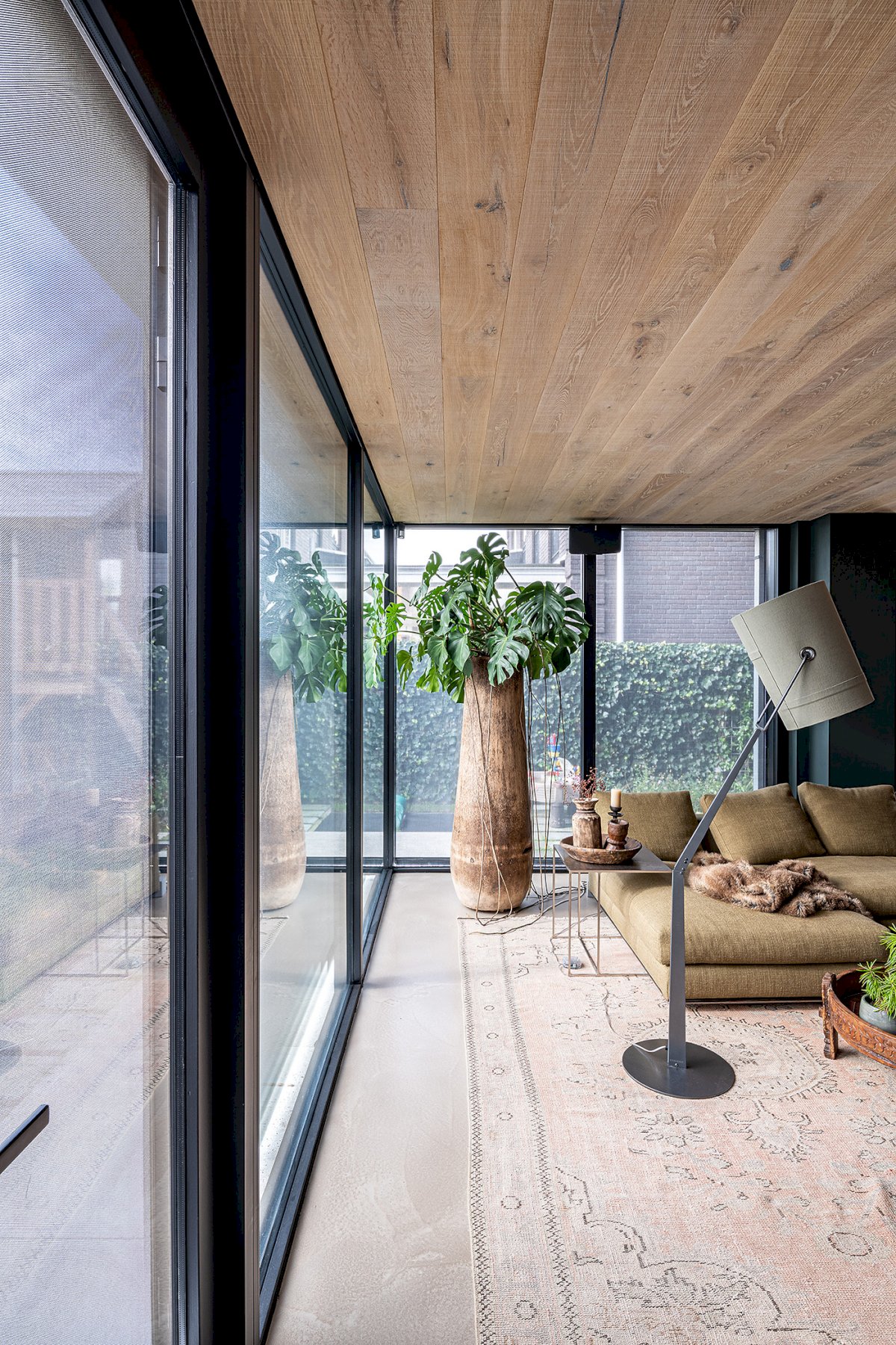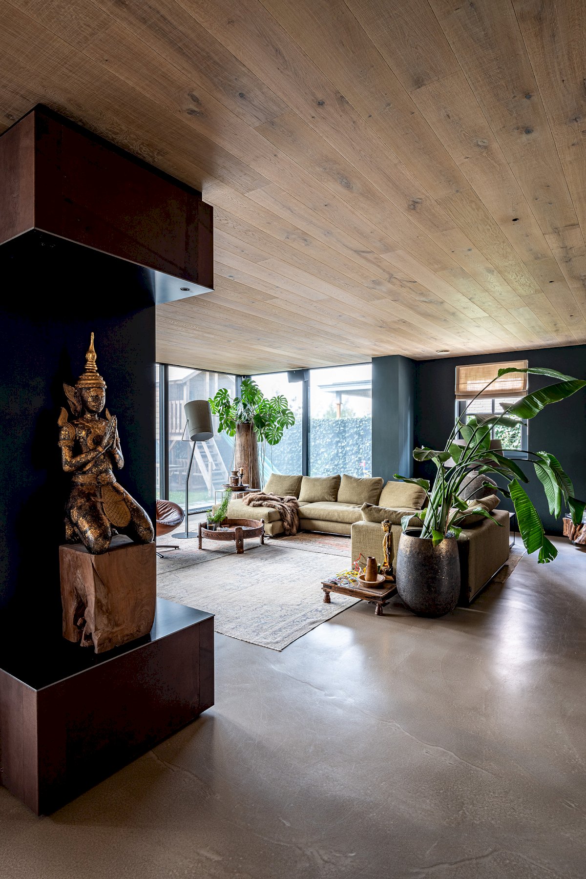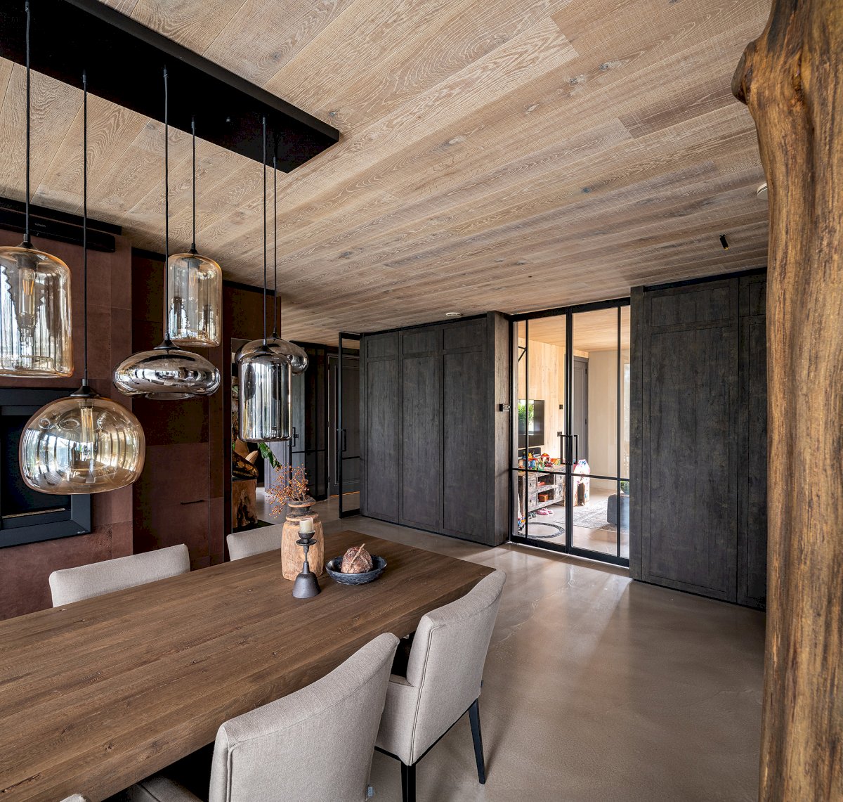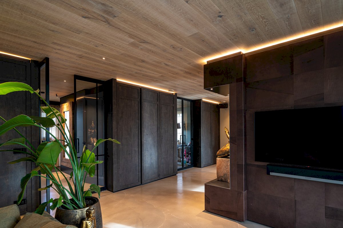 Een vloer die gedeeltelijk doorloopt op de muur van een woonkamer had ik wel eerder gezien, maar het hele plafond van de benedenverdieping van een woning was echt nieuw voor mij.